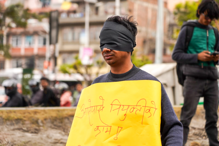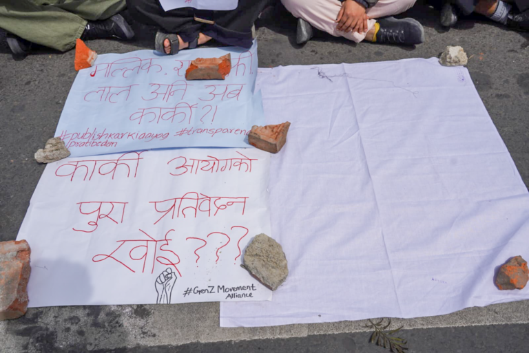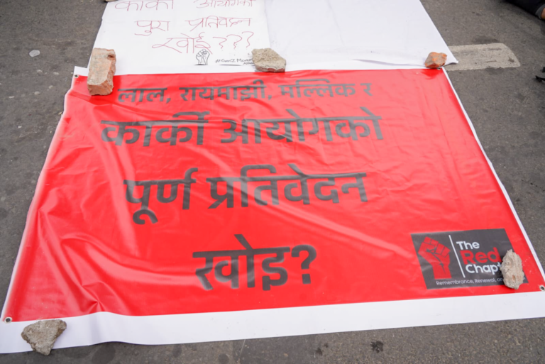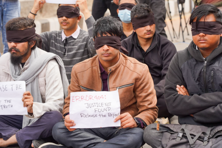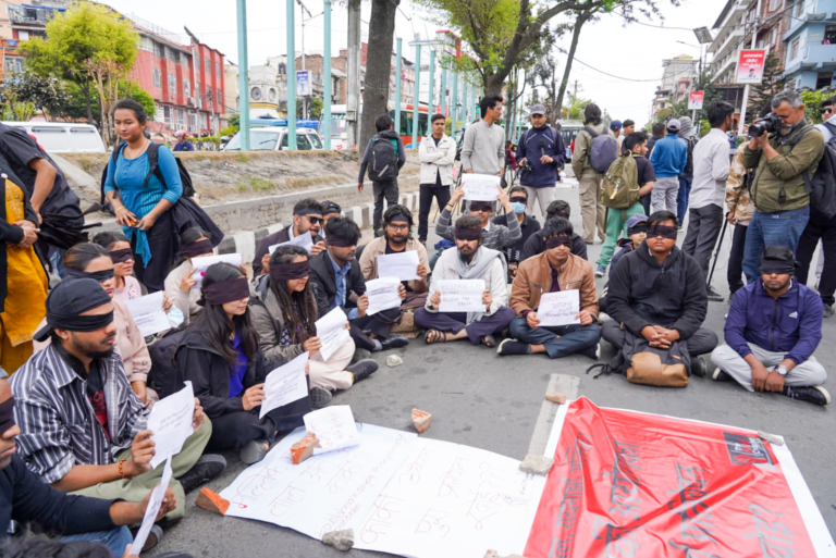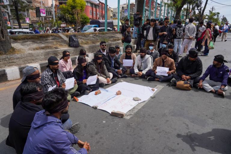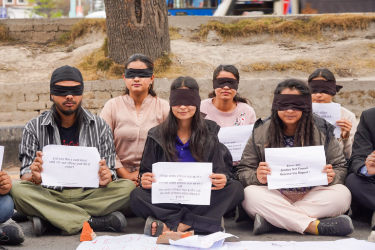 उनीहरूले कार्की आयोगको पूर्ण प्रतिवेदन खाेइ ? भन्दै आँखामा कालोपट्टी बाँधेर प्रर्दशनमा छन् ।