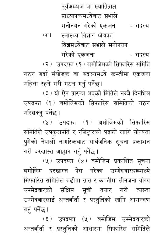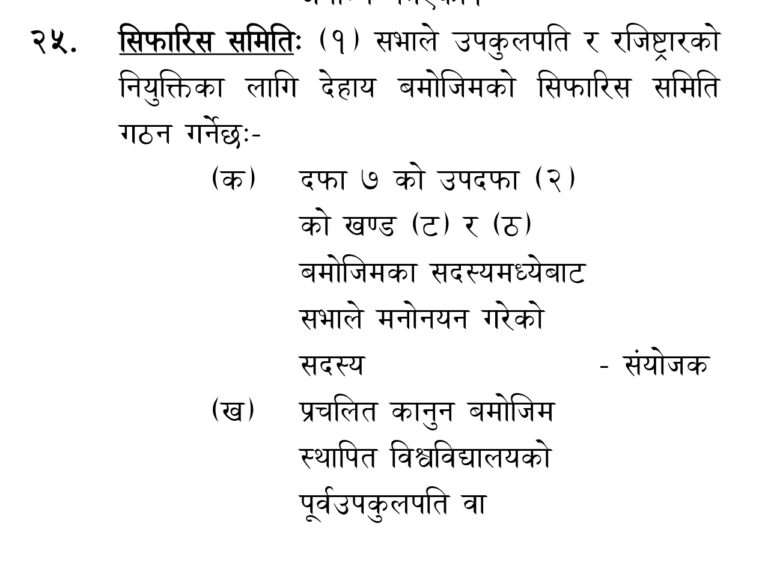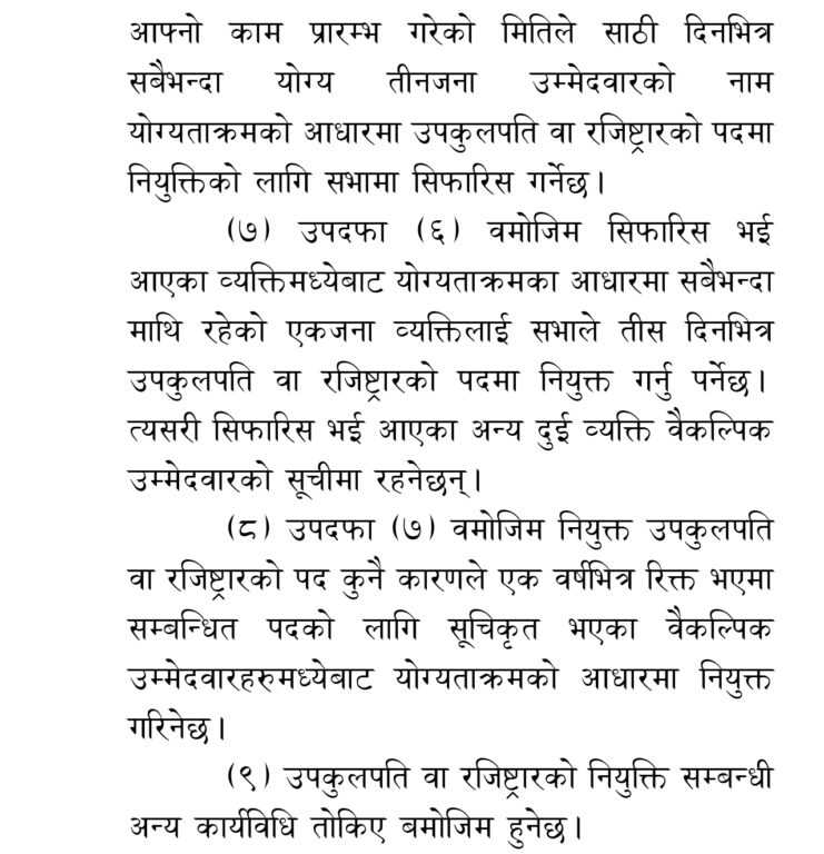 सिफारिस समिति गठनपछि समितिले काम प्रारम्भ गरेको ६० दिनभित्र सबैभन्दा योग्य ३ जना उम्मेदवारको नाम योग्यताक्रमको आधारमा उपकुलपति वा रजिष्ट्रारको पदमा नियुक्तिको लागि सभामा सिफारिस गर्नेछ । सिफारिस भइआएका व्यक्तिमध्ये सभाले ३० दिनभित्र उपकुलपति वा रजिष्ट्रारको पदमा नियुक्त गर्नुपर्ने प्रावधान ऐनमा छ ।