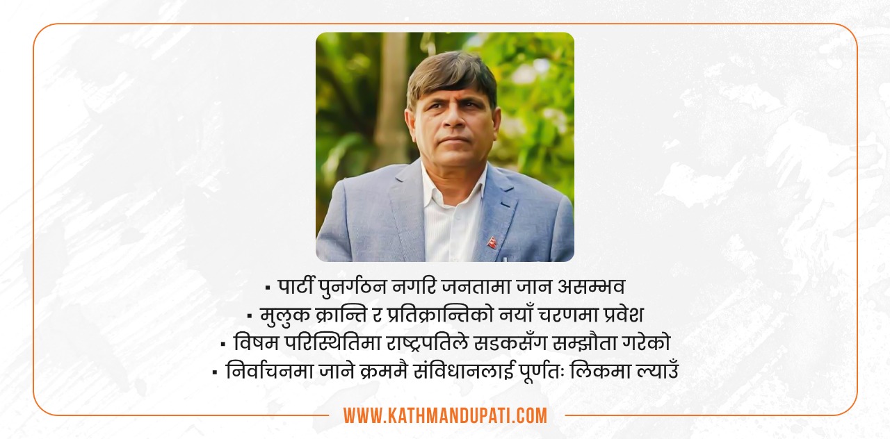 ‘हाम्रा सबै पार्टीले आज वा भोलि पुनर्गठन नगरिकन जनतामा जान किमार्थ सम्भव छैन । यस विषयमा पार्टीव्यापी छलफल चलाउन तयार होऔँ । यो मुख्य विषयलाई गलैँचामुनि राखेर अरू विषयलाई अगाडि राख्न थाल्यौँ भने दुनियाँले हामीलाई दुत्कार्ने छ । ‘पार्टीहरूको पुनर्गठन र राष्ट्रिय पुनरुत्थानमा हाम्रा एजेन्डा’ भन्ने विषयमा राष्ट्रिय बहस हामीबाट सुरु हुनु सम्पूर्ण पार्टी परिवारका लागि गौरवको कुरा हुनेछ’ भुसालले प्रस्तावमा भनेका छन् ।