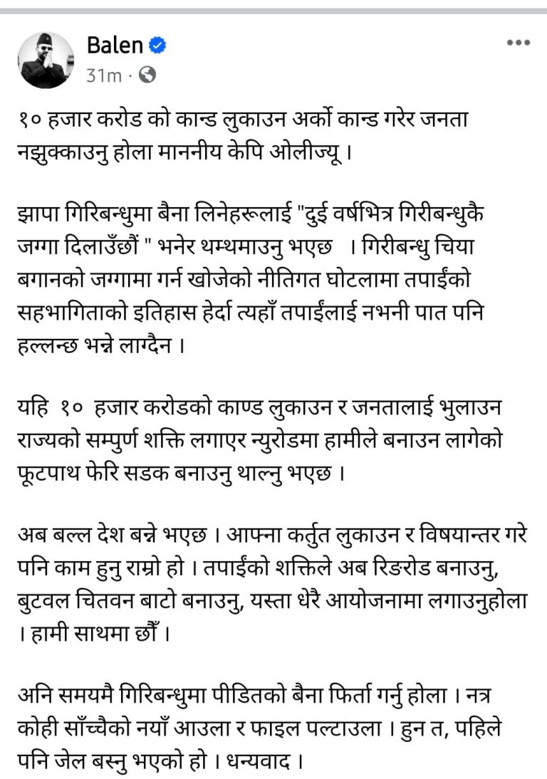 गिरीबन्धु चिया बगान जग्गाको भ्रष्टाचारमा ओलीको संलग्नता नहोला भन्न नसकिने बालेनको आशय छ । ‘१० हजार करोडको काण्ड लुकाउन अर्को काण्ड गरेर जनता नझुक्काउनु होला माननीय केपी ओलीज्यू,’ बालेनले लेखेका छन्, ‘गिरीबन्धु चिया बगानको जग्गामा गर्न खोजेको नीतिगत घोटलामा तपाईंको सहभागिताको इतिहास हेर्दा त्यहाँ तपाईंलाई नभनी पात पनि हल्लन्छ भन्ने लाग्दैन ।’