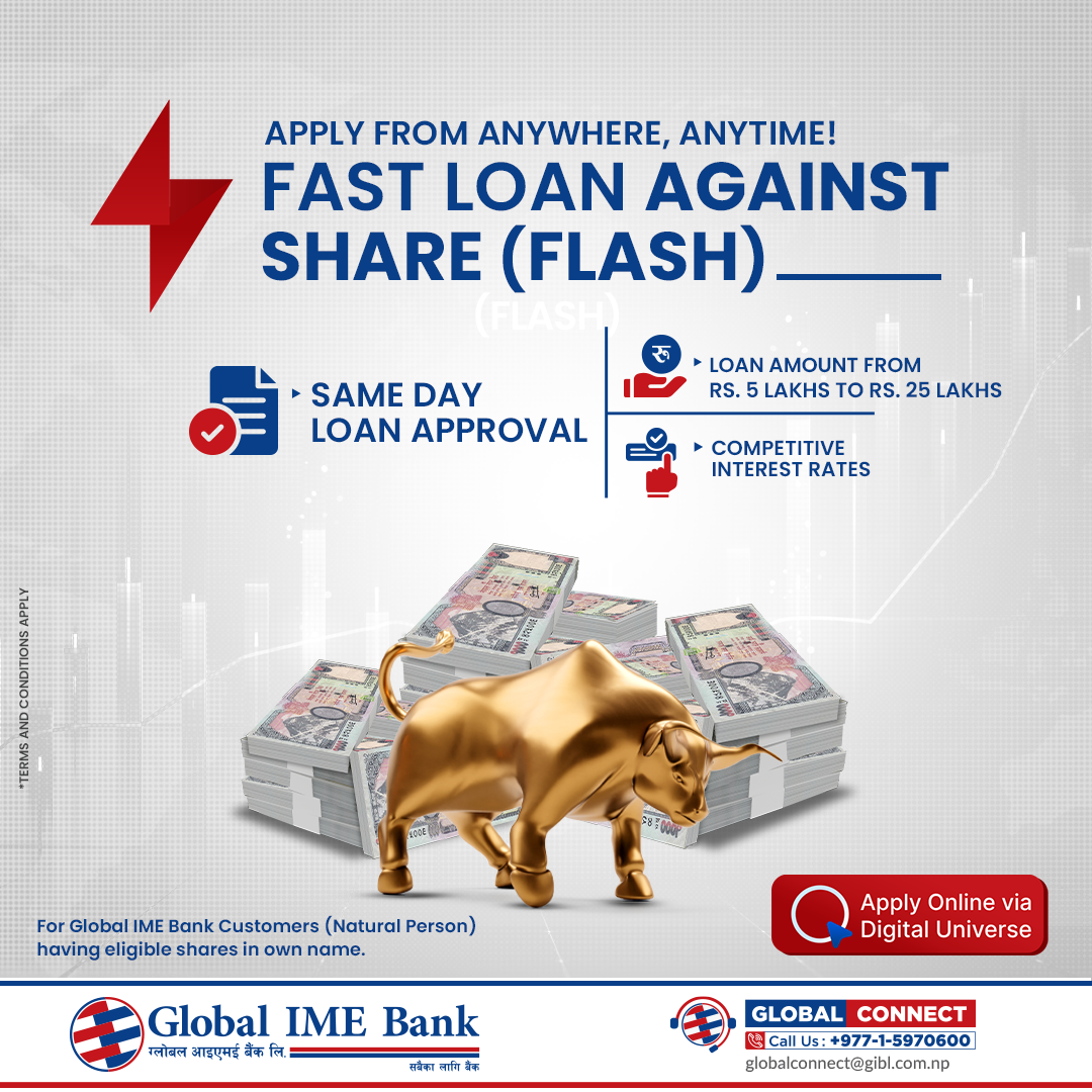 काठमाण्डु-ग्लोबल आइएमई बैंक लिमिटेडले फास्ट लोन अगेन्स्ट शेयर प्लेटफर्म सार्वजनिक गरेको छ । यसअन्तर्गत इच्छुक ग्राहकले अनलाइनबाट सेयर धितो कर्जाको लागि आवेदन दिन सक्ने छन् ।