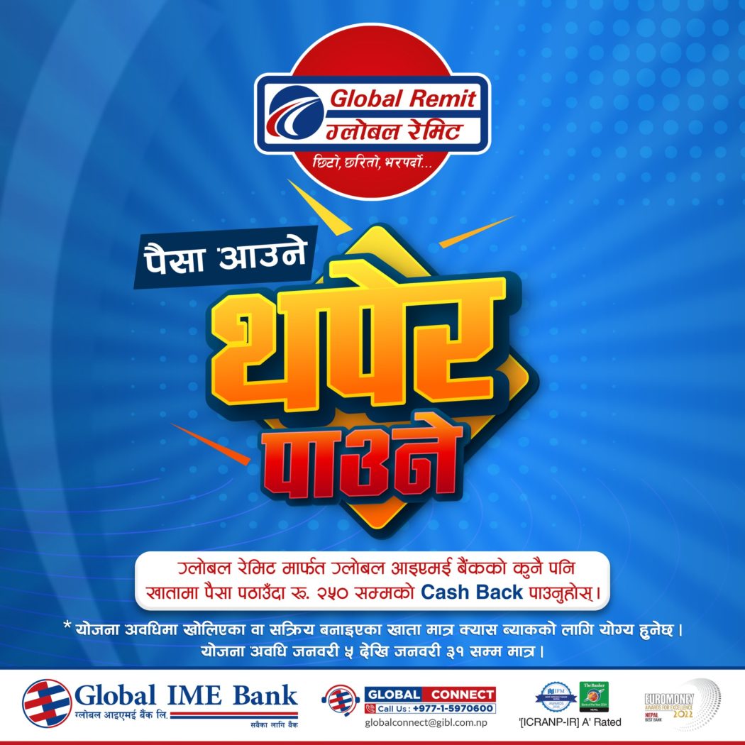 पैसा आउने, थपेर पाउने नारा सहित सार्वजनिक गरेको क्यासब्याक योजनामा ग्लोबल रेमिटमार्फत विदेशबाट ग्लोबल आइएमई बैंकमा रहेको खातामा पैसा पठाउँदा २५० रुपैयाँसम्मको क्यासब्याक पाइने बैंकले जनाएको छ ।