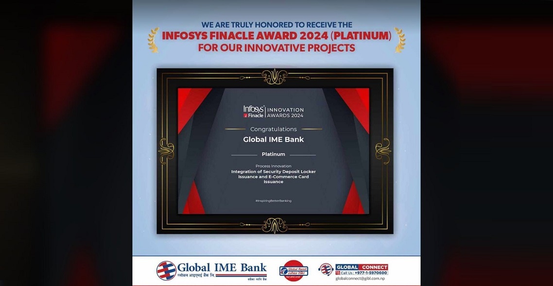 इन्फोसिस फिनाकलद्वारा आयोजित अवार्ड वितरण कार्यक्रममा ग्लोबल आइएमई बैंकलाई इन्ट्रिग्रेसन अफ सेक्युरिटी डिपोजिट लकर इसुयन्स एण्ड इकमर्स कार्ड इसुयन्स विधामा उत्कृष्ट बैंकको रुपमा सम्मान गरिएको हो ।