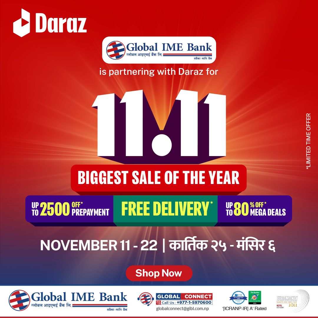 काठमाण्डु – ग्लोबल आइएमई बैंक लिमिटेडका ग्राहकहरुले दराजको ११ः११ अफरमा दराजबाट अनलाइनमार्फत सामानकिन्दा २० प्रतिशत छुट दिने योजना सार्वजनिक गरेको छ ।