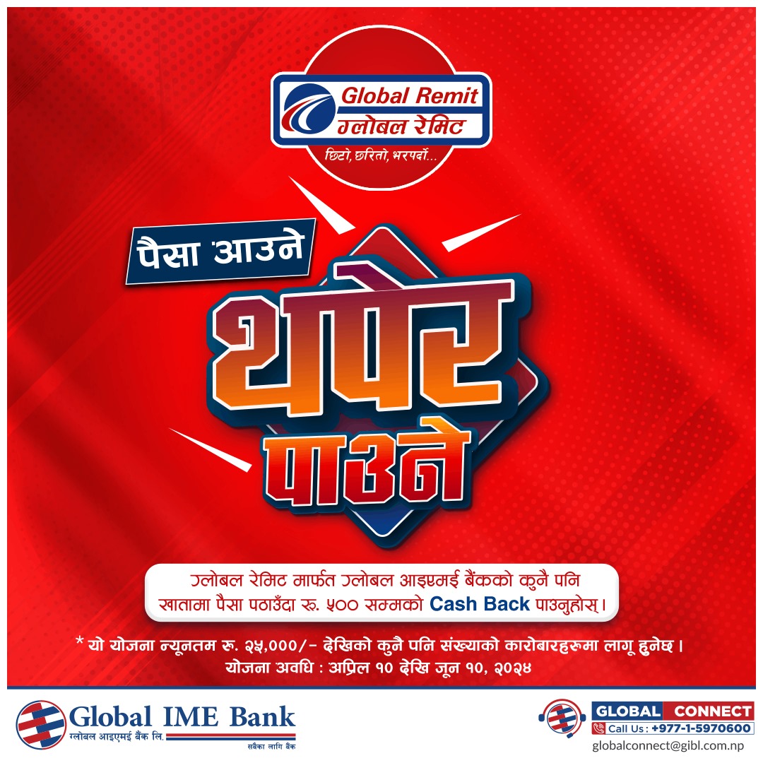 ग्लोबल आइएमई बैैकमा भएको कुनै पनि खातामा ग्लोबल रेमिटमार्फत पैसा पठाउँदा बैंकले रेमिट्यान्समार्फत आएको पैसामा ५०० रुपैयाँ सम्म थप गरिदिनेछ ।