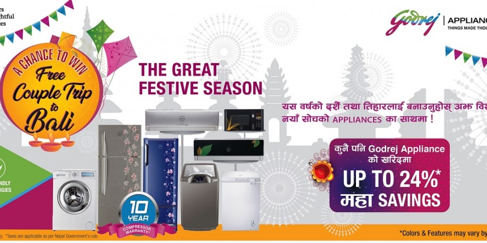 काठमाडौं – गोदरेज अप्लाएन्सेस्, ब्राण्डले चाडपर्वको अवसरमा ग्राहकहरु माझ ‘फ्रि कपल ट्रिप टु बाली’ अफर ल्याएको छ। यो योजना अन्र्तगत गोदरेजले ग्राहकवर्गहरुमा आश्चर्य र खुशीको बहार ल्याएको छ।