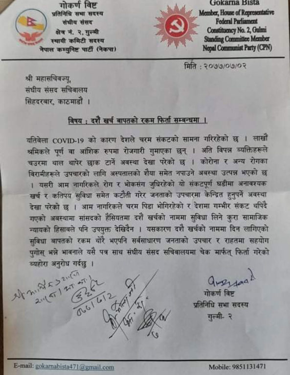 ‘यसकारण दसैं खर्चको नाममा दिन लागिएको सुविधा बापतको रकम थोरै भएपनि सर्वसाधारण जनताको उपचार र राहतमा सहयोग पुगोस् भन्ने भावनाले यसै पत्र साथ संघीय संसद सचिवालयमा चेक मार्फत् फिर्ता गरेको ब्यहोरा अनुरोध गर्दछु’, उनले भनेका छन् ।