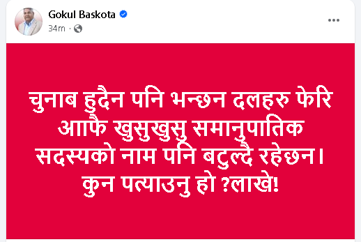 भित्रभित्रै समानुपातिक उम्मेदवारको नाम कुन दलले संकलन गरे, उनले खुलाएका छैनन्। ‘चुनाब हुँदैन पनि भन्छन् दलहरू फेरि आफै खुसुखुसु समानुपातिक सदस्यको नाम पनि बटुल्दै रहेछन्। कुन पत्याउनु होरु लाखे !,’ उनले व्यंग्यात्मक शैलीमा लेखेका छन्।