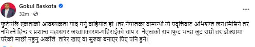 काठमाण्डु – नेकपा (एमाले)का पोलिटब्यूरो सदस्य गोकुल बास्कोटाले पार्टी अध्यक्ष केपी शर्मा ओलीप्रति कटाक्ष गरेका छन्।