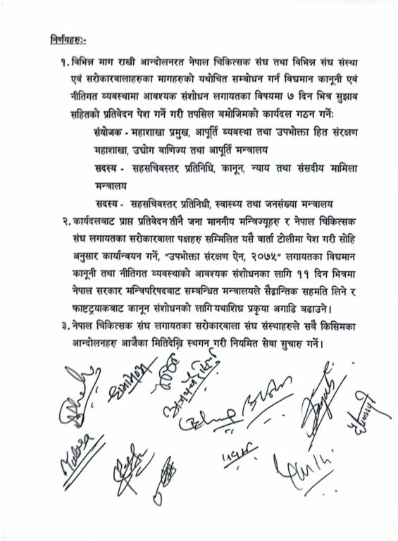 सहमति अनुसार, संघले घोषणा गरेका सबै आन्दोलनका कार्यक्रमहरू फिर्ता लिएको छ । उपभोक्ता अदालतले चिकित्सकीय अभ्यास सम्बन्धी पछिल्ला मुद्दामा सुनाएको फैसलाले नेपाल मेडिकल काउन्सिलको क्षेत्राधिकारमाथि हस्तक्षेप भएको भन्दै नेपाल चिकित्सक संघले सोमबारदेखि देशभरका अस्पतालमा आकस्मिक बाहेकका सेवा ठप्प पारेको थियो ।