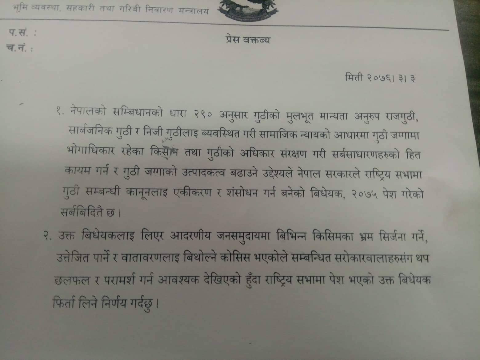 भूमि व्यवस्था, सहकारी तथा गरिबी निवारण मन्त्री पद्मा अर्यालले पत्रकार सम्मेलन गरेर मंगलबार सरकारले गुठी विधेयक फिर्ता लिएको जानकारी दिएकी छन् ।