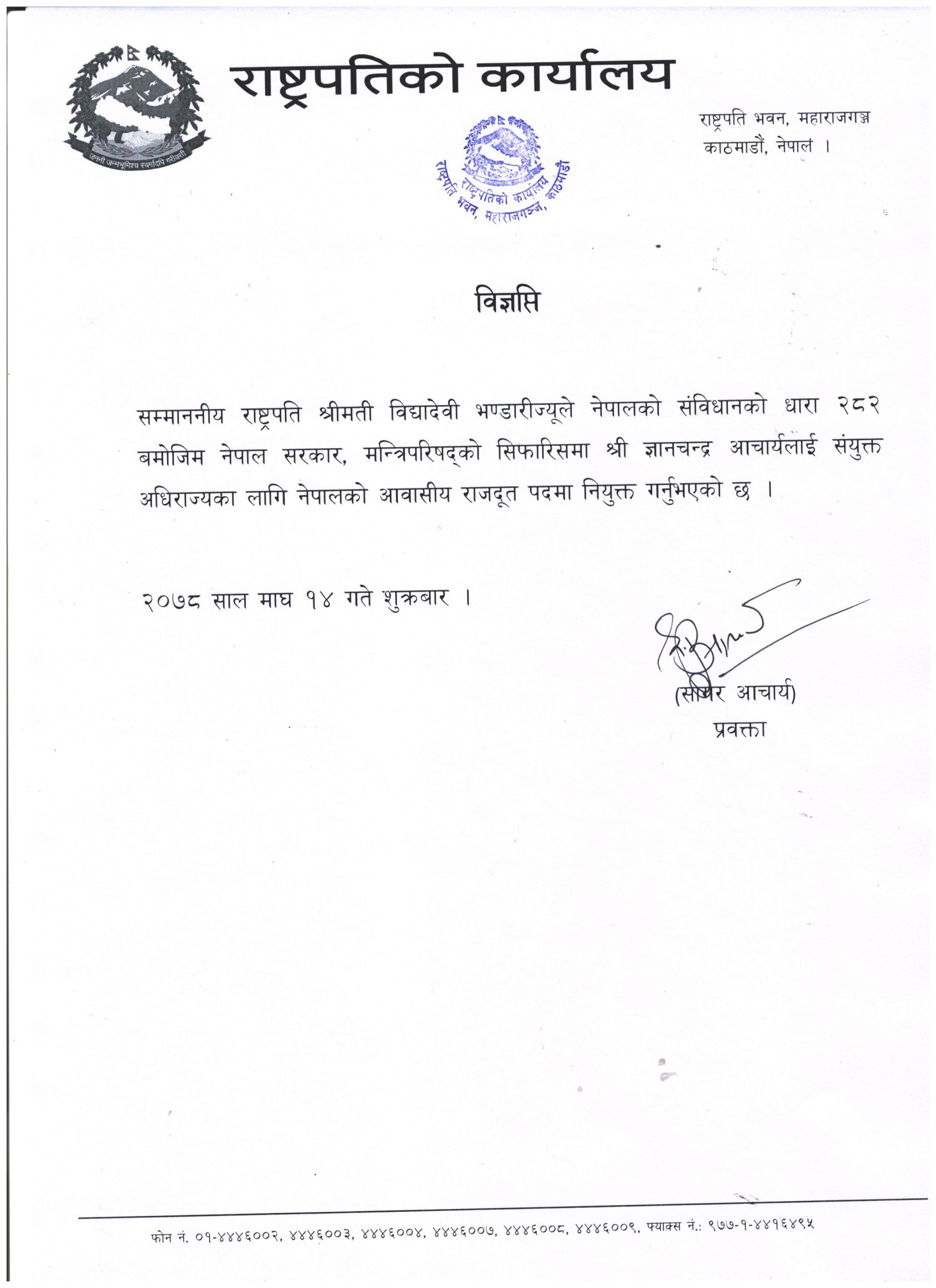 राष्ट्रपति कार्यालयका प्रवक्ता सागर आचार्यले वित्रप्ति जारी गर्दै राष्ट्रपतिले आज ज्ञानचन्द्रलाई राजदूत नियुक्त गरेको जानकारी दिएका छन् ।