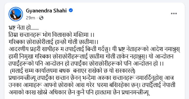 उनले लेखेका छन्, ‘भ्रष्ट नेता हो … तिम्रा सन्तानहरू भोगविलासको मस्तिमा । गरीबका छोराछोरीलाई हान्छौ गोली छातीमा । आदरणीय प्रहरी साथीहरु म तपाईंलाई बिन्ती गर्दछु – यी भ्रष्ट नेताहरूको आदेश नमान्नुस्, हामी निमुखा गरीबका छोराछोरीहरूलाई छातीमा गोली ताकेर नहान्नुस् । यो आन्दोलन तपाईंहरूको पनि आन्दोलन हो, तपाईंका छोराछोरीहरूको पनि आन्दोलन हो । (मलाईसम्म कार्यालयमा बन्धक बनाएर राखेको छ यो सरकारले) प्रधानमन्त्रीज्यू, तपाईंका सन्तान छैनन् भन्दैमा अरुका सन्तानहरू नमारर्दिनुहोस्, आज उनका आमाहरू आफ्नो छोराको आश गरेर घरमा बसिरहेका छन् । तपाईंलाई नेपाली आमाको काँख खोस्ने अधिकार छैन, कुनै पनि हालतमा छैन प्रधानमन्त्रीज्यू ।’