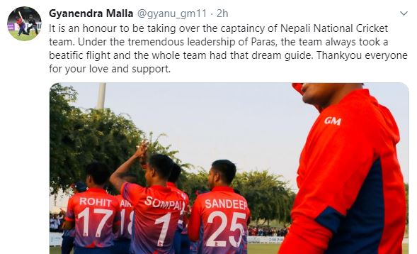मल्लले लेखेका छन्, ‘नेपाली क्रिकेट टिमको कप्तान बन्न पाउनु सम्मानको विषय हो ।’