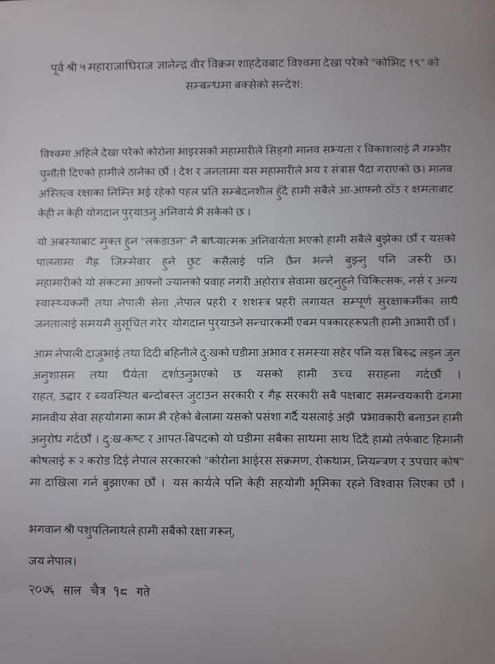 कोरोना कोषमा २ करोड सहयोग गर्ने पूर्वराजाको घोषणा, सुरक्षाकर्मीलाई दिए धन्यवाद