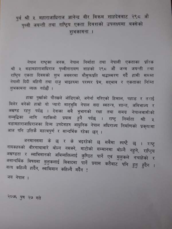 पृथ्वी जयन्तीको पूर्वसन्ध्यामा विज्ञप्ति जारी गर्दै शाहले मातृभूमि नेपाल सदा स्वतन्त्र, शान्त, अभिभाज्य र अखण्ड रहनुपर्ने जनाएका छन् ।