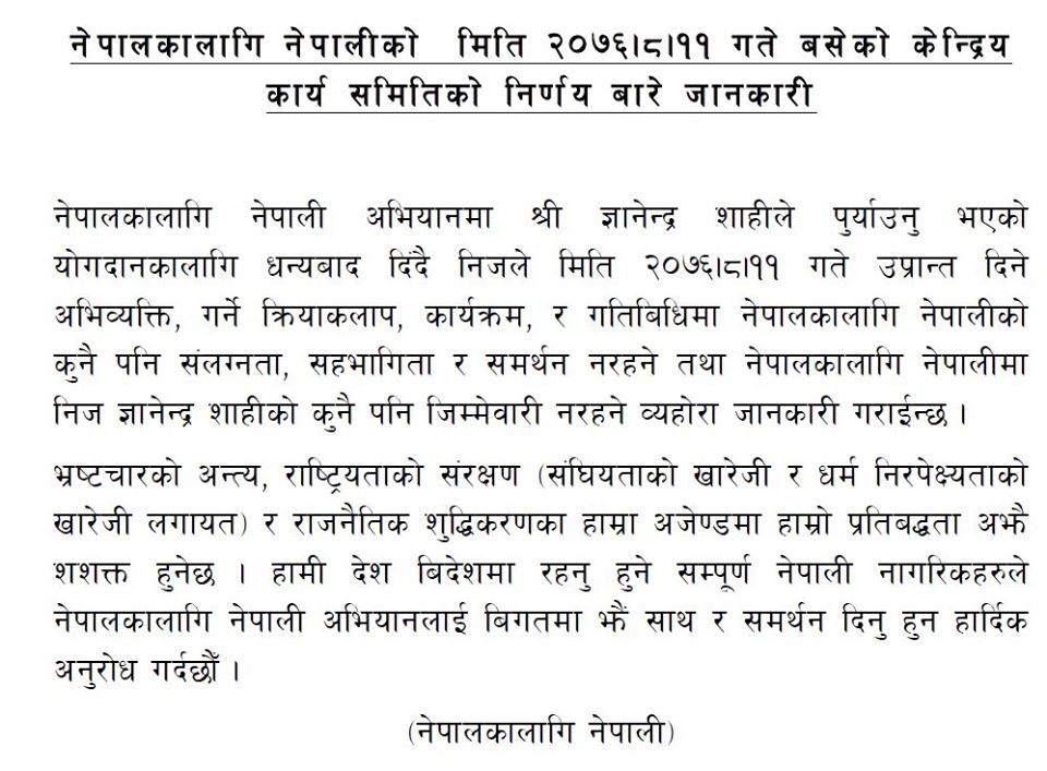 अब उप्रान्त शाहीका कुनै पनि अभिव्यक्ति र कार्यक्रममा नेपालका लागि नेपाली अभियानको संलग्नता नरहने अभियानले जनाएको छ ।