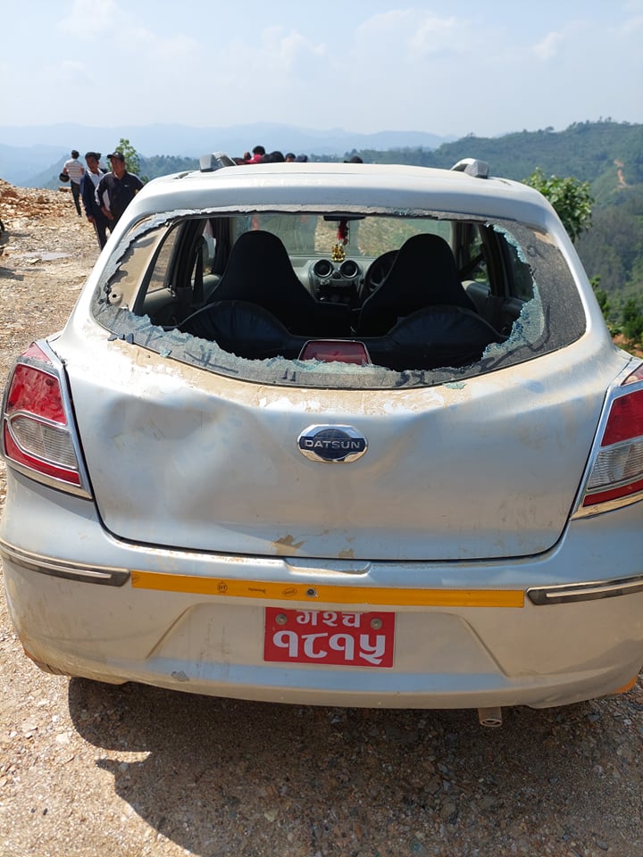 कांग्रेस कार्यकर्ताले हानेको ढुंगा लागेर एमालेका कार्यकर्ताले चढ्दै आएको ग२च १८०५ नम्बरको कारमा क्षति पुगेको पोखरीछाप प्रहरी चौकीका प्रहरी निरीक्षक राजकुमार विकले बताए । उनका अनुसार गाडीको सिसा फुटेको छ ।