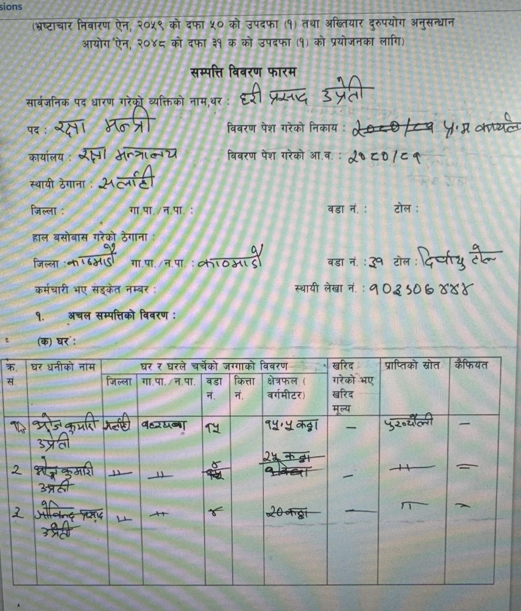 उनले आफैसँग नगद पैसा छ कि छैन भन्नेबारे पनि खुलाएका छैनन् । घर भएको नभएको बारे पनि कुनै खुलाएका छैनन् ।