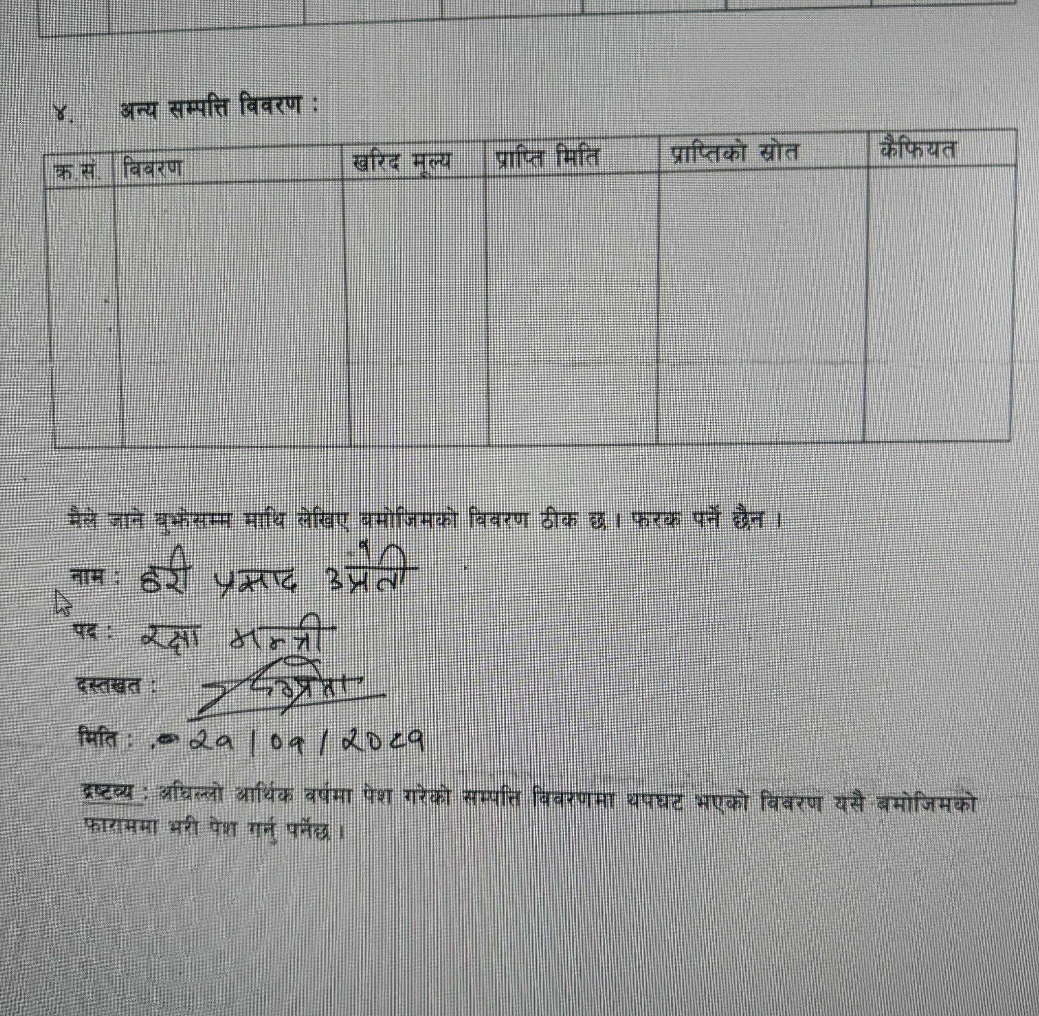 काठमाण्डु – रक्षामन्त्री हरिप्रसाद उप्रेतीको बैँक खाता नभएको तथ्य सार्वजनिक भएको छ । सरकारले मंगलबार प्रधानमन्त्री तथा मन्त्रीपरिषद् कार्यालयले सार्वजनिक गरेको प्रधानमन्त्री तथा मन्त्रीहरूको सम्पत्ति विवरणमा रक्षामन्त्री उप्रेतीले पेस गरेको सम्पत्ति विवरणमा उनको वैँक खाता नै नभएको देखिएको हो ।