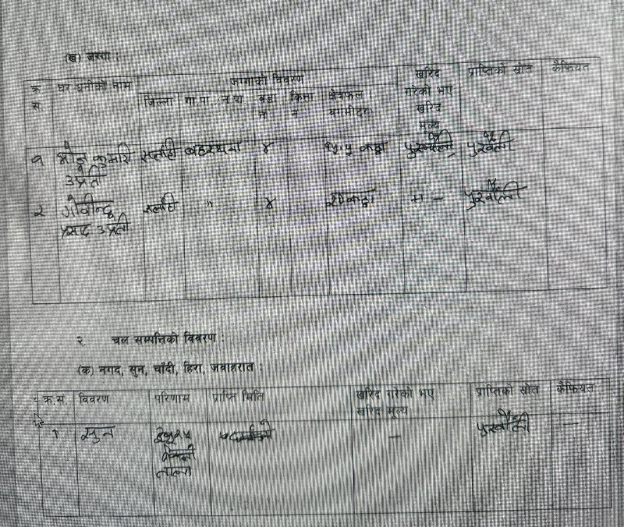 उनले सार्वजनिक गरेको सम्पत्रि विवरणमा भोजकुमारी उप्रेतीको नाममा पुख्र्यौली सर्लाहीका तीन स्थानमा जग्गा, २५ तोला सुन र एउटा गाडी मात्रै भएको उल्लेख छ ।