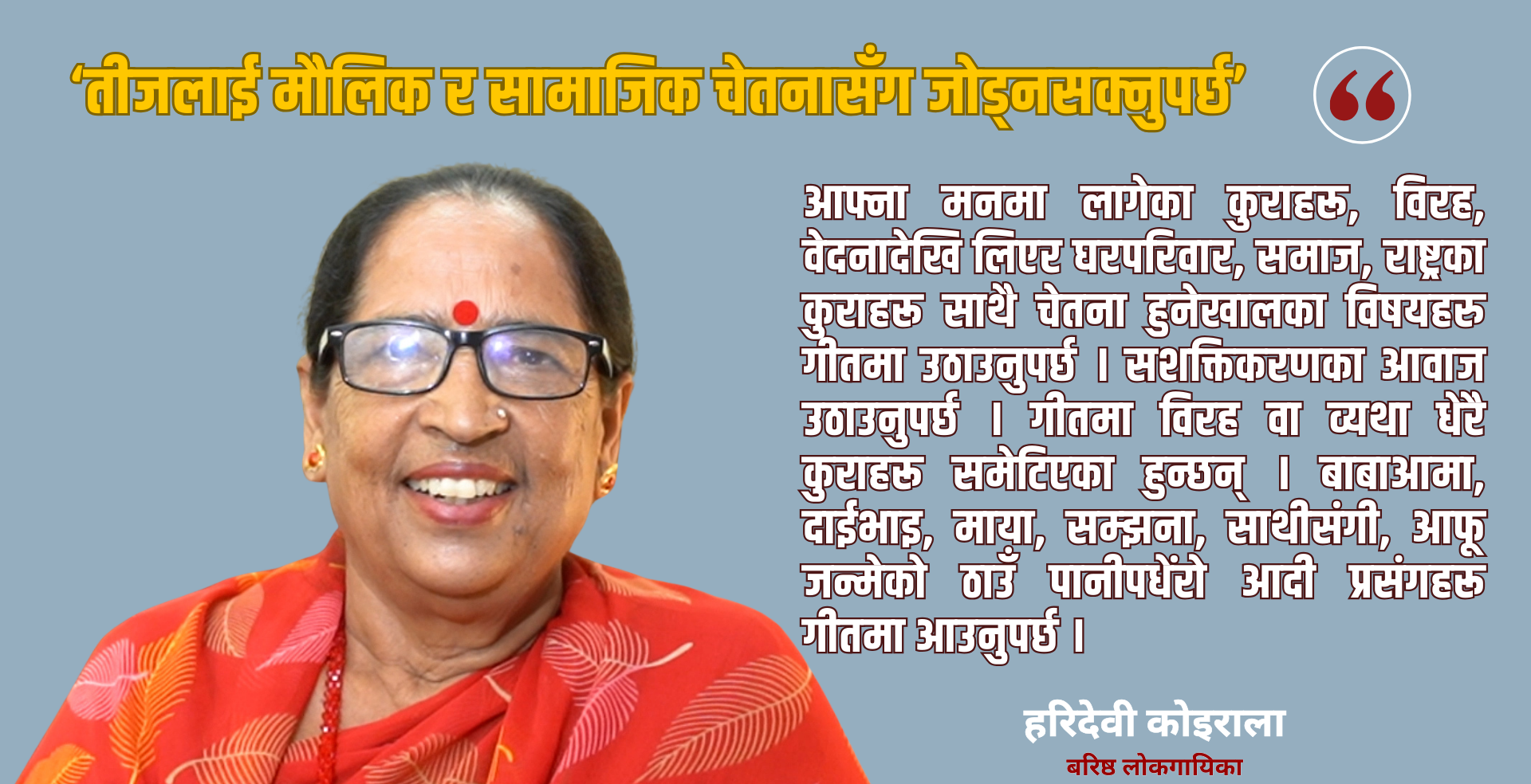 २०४५ सालदेखि तीज गीत गाउन थालेकी हरिदेवी तीजलाई शुद्ध, मौलिक र सामाजिक चेतनासँग जोडिएको पर्वका रूपमा हेर्छिन् । उनीसँग गरिएको कुराकानी