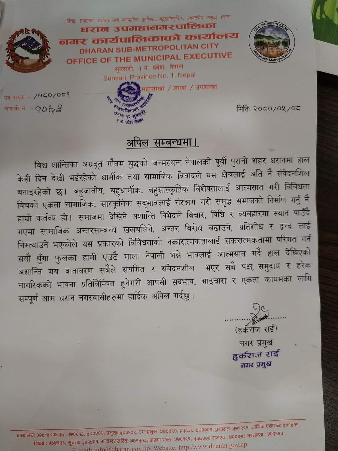 शुक्रवार दिउँसो एक अपिल जारी गर्दै उनले धरानमा भइरहेको धार्मिक तथा सामाजिक विवादले अति नै संवेदनशील बनाइरहेको बताए ।