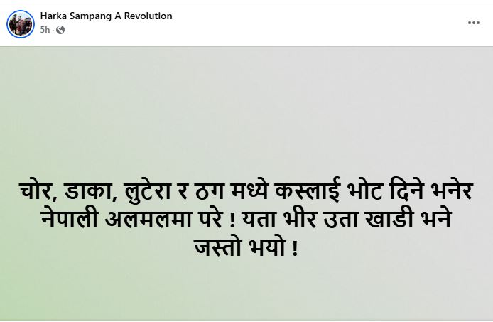 त्यसपछि अर्को स्टाटस राख्दै उनले भनेका छन्, ‘चोर, डाका, लुटेरा र ठगमध्ये कसलाई भोट दिने भनेर नेपाली अलमलमा परे, यता भीर उता खाडी भने जस्तो भयो !’ उनले यसमा कसैको नाम नलिएको भएपनि यो रवि लक्षित नै भएको देखिन्छ ।
