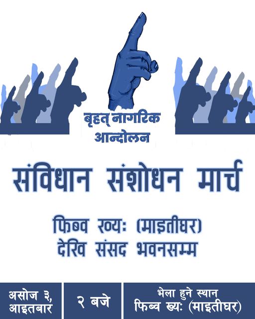 आज दिउँसो २ बजे माइतीघरमा भेला भएर नयाँ बानेश्वरस्थित संसद भवनअगाडि मार्च गरिने बृहत् नागरिक आन्दोलनले जानकारी दिएको छ । संविधान जारी गर्दा असन्तुष्ट भएका समुदायहरूलाई हालसम्म पनि विश्वासमा लिने प्रयास नभएको तथा संविधान अधुरो र अपुरो रहेको बृहत् नागरिक आन्दोलनको ठम्याइ छ ।
