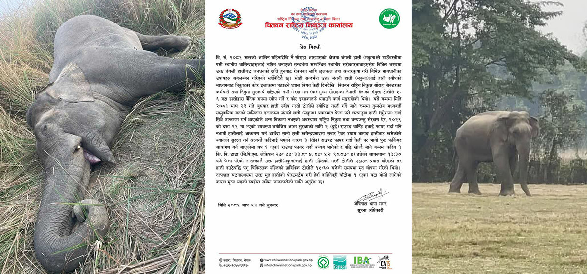 काठमाण्डु- चितवन राष्ट्रिय निकुञ्जमा नेपाली सेनाले चलाएको गोली लागेर जंगली हात्ती मकुनाको मृत्यु भएको छ । बुधबार कुमरोज सामुदायिक वनको लामिताल इलाकामा आत्मरक्षाका लागि गोली चलाउँदा मकुनाको मृत्यु भएको निकुञ्जले जनाएको छ ।