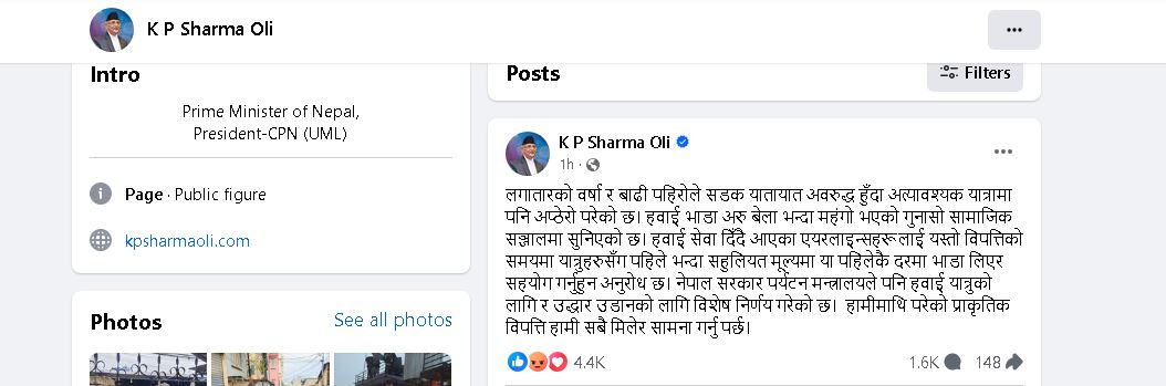 ‘लगातारको वर्षा र बाढीपहिरोले सडक यातायात अवरुद्ध हुँदा अत्यावश्यक यात्रामा पनि अप्ठेरो परेको छ । हवाई भाडा अरू बेलाभन्दा महँगो भएको गुनासो सामाजिक सञ्जालमा सुनिएको छ । हवाई सेवा दिँदै आएका एयरलाइन्सहरूलाई यस्तो विपत्तिको समयमा यात्रुहरूसँग पहिलेभन्दा सहुलियत मूल्यमा या पहिलेकै दरमा भाडा लिएर सहयोग गर्नुहुन अनुरोध छ,’ प्रधानमन्त्री ओलीले फेसबुकमा लेखेका छन् ।