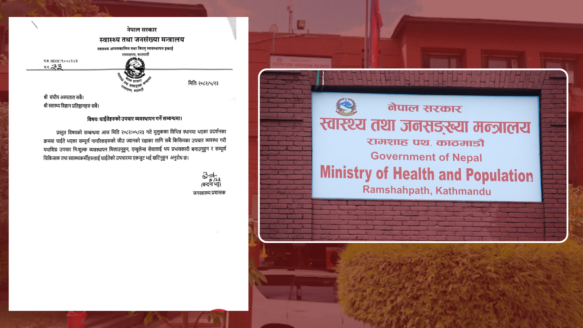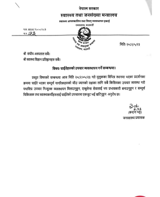 स्वास्थ्य तथा जनसंख्या मन्त्री प्रदीप पौडेलको अग्रसरतामा मन्त्रालयले संघीय अस्पतालमा आउने आन्दोलनका घाइतेलाई कुनै शुल्क नलाग्ने गरी शीघ्र उपचारको व्यवस्था गर्न भनेको छ ।