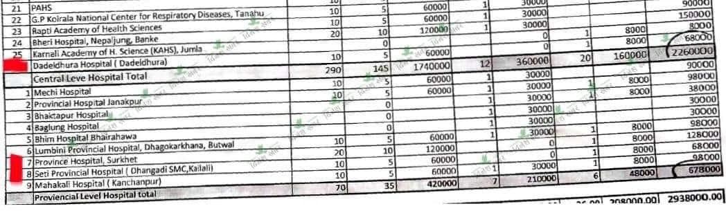 जसअनुसार सेती अस्पतालमा १० आइसीयू, ५ भन्टिलेटर र अक्सिजन ट्याङ्क खरिद गर्न ६ करोड ८० लाख, महाकाली अस्पतालमा १० आइसीयू, ५ भन्टिलेटरसहित एउटा अक्सिजन प्लान्ट र अक्सिजन ट्याङ्क जडान गर्न ९ करोड ८० लाख, त्यस्तै डडेल्धुरा अस्पतालमा पनि १० आइसीयू, ५ भन्टिलेटर र एउटा अक्सिजन टयाङ्क खरिद गर्न ६ करोड ८० लाख बजेट निकासा गरिएको हो ।