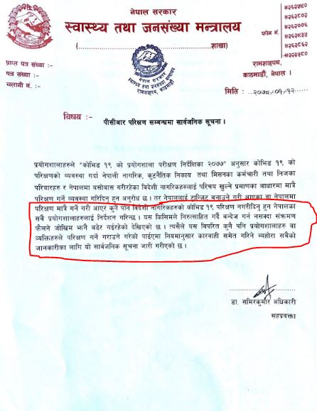 ‘नेपाललाई ट्रान्जिट बनाई अन्यत्र जान नेपाली बाहेकको हकमा हिजोसम्ममा नेपाल आई क्वारेन्टाइनमा बसेकाहरुलाई पिसिआर परीक्षण गरिदिनुहुन सबै प्रयोशालाहरुलाई सुचित गरिन्छ,‘ विज्ञप्तिमा भनिएको छ ।
