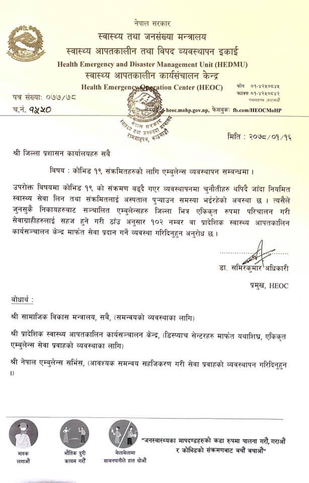 ‘कोभिड–१९ को सङ्क्रमण बढ्दै गएर व्यवस्थापनमा चुनौतीहरु थपिँदै जाँदा नियमित स्वास्थ्य सेवा लिन तथा सङ्क्रमितलाई अस्पताल पुर्याउन समस्या भइरहेको अवस्था छ’, पत्रमा भनिएको छ, ‘त्यसैले जुनसुकै निकायबाट सञ्चालित एम्बुलेन्सहरु जिल्लाभित्र एकीकृतरूपमा परिचालन गरी सेवाग्राहीलाई सहज हुने गरी १०२ नम्बरको व्यवस्था गरिदिन अनुरोध छ ।’