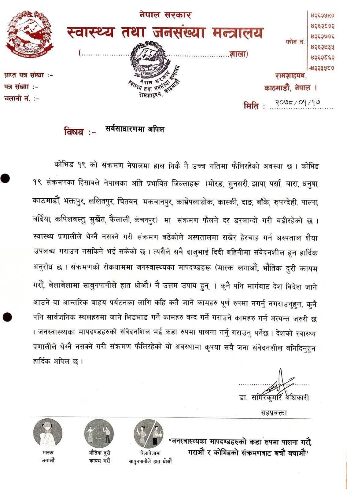 देशको संरचनाले थेग्नै नसक्नेगरी संक्रमण फैलन लागेकाले स्वास्थ्य मापदण्डको पालना गर्न भनेको छ ।