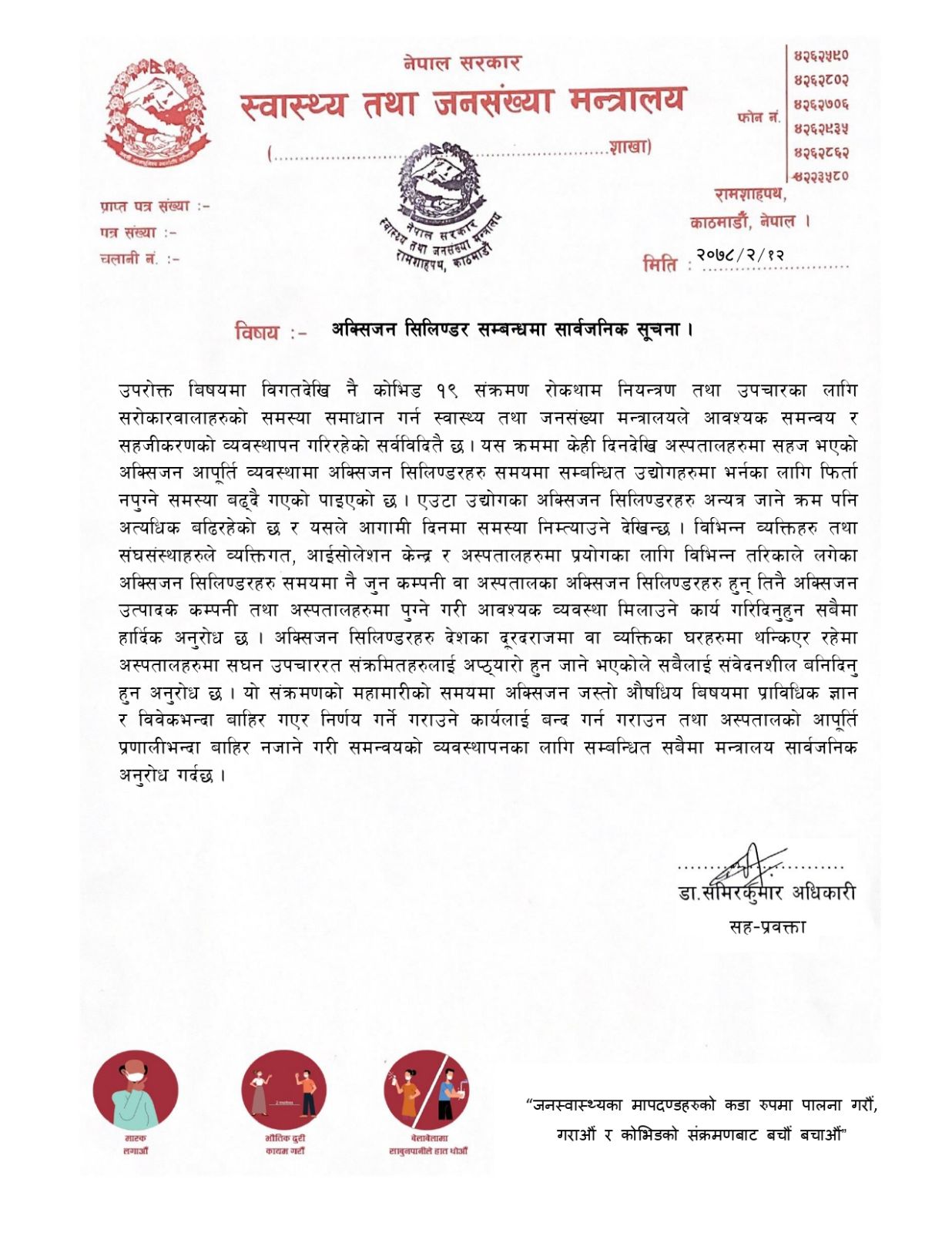 अहिले अक्सिजन आपूर्ती सहज भएकाले आफुसंग भएका सिलिन्डर भर्नकालागि सम्बन्धित उद्योगमा फिर्ता गर्न मन्त्रालयले आग्रह गरेको छ । विभिन्न व्यक्तिहरु तथा संघ/संस्थाहरुले व्यक्तिगत, आईसोलेशन केन्द्र र अस्पतालहरुमा प्रयोगका लागि विभिन्न तरिकाले लगेका अक्सिजन सिलिण्डरहरु समयमा नै जन कम्पनी वा अस्पतालका अक्सिजन सिलिण्डरहरु अक्सिजन उत्पादक कम्पनी तथा अस्पतालहरुमा नपुगेको मन्त्रालयले जनाएको छ ।