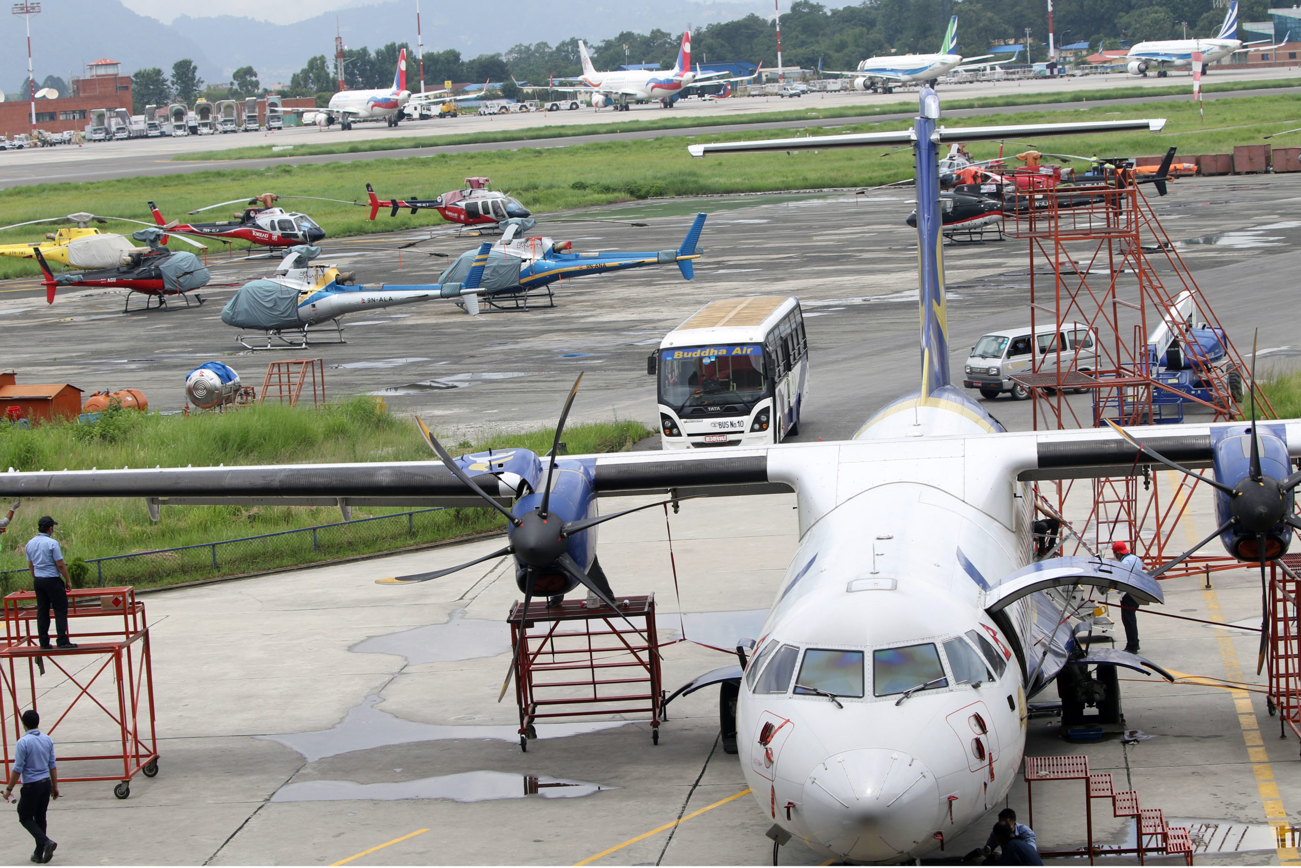 त्यस्तै त्रिभुवन अन्तरराष्ट्रिय विमानस्थलमा प्राविधिकहरु हवाइजहाज मर्मत गर्न व्यस्त रहेका छन् ।