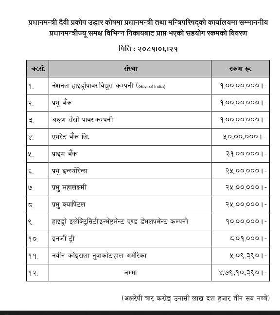 नेसनल हाइड्रोपावर विद्युत् कम्पनीले १ करोड, प्रभू बैंकले १ करोड, अरुण तेस्रो पावर कम्पनीले १ करोड, एभरेस्ट बैंकले ५० लाख, प्राइम बैंकले ३१ लाख, प्रभू इन्स्योरेन्सले २५ लाख, प्रभू महालक्ष्मीले २५ लाख, प्रभू क्यापिटलले २५ लाख, हाइड्रो इलेक्ट्रिसिटी इन्भेष्टमेन्ट एण्ड डेभलपमेन्ट कम्पनीले १० लाख, इनर्जी ट्रीले ८ लाख १ हजार, नवीन कोइराला नुवाकोट (हाल अमेरिका) ले ५ लाख ९ हजार ३९० रुपैयाँ सहयोग गरेका छन् ।