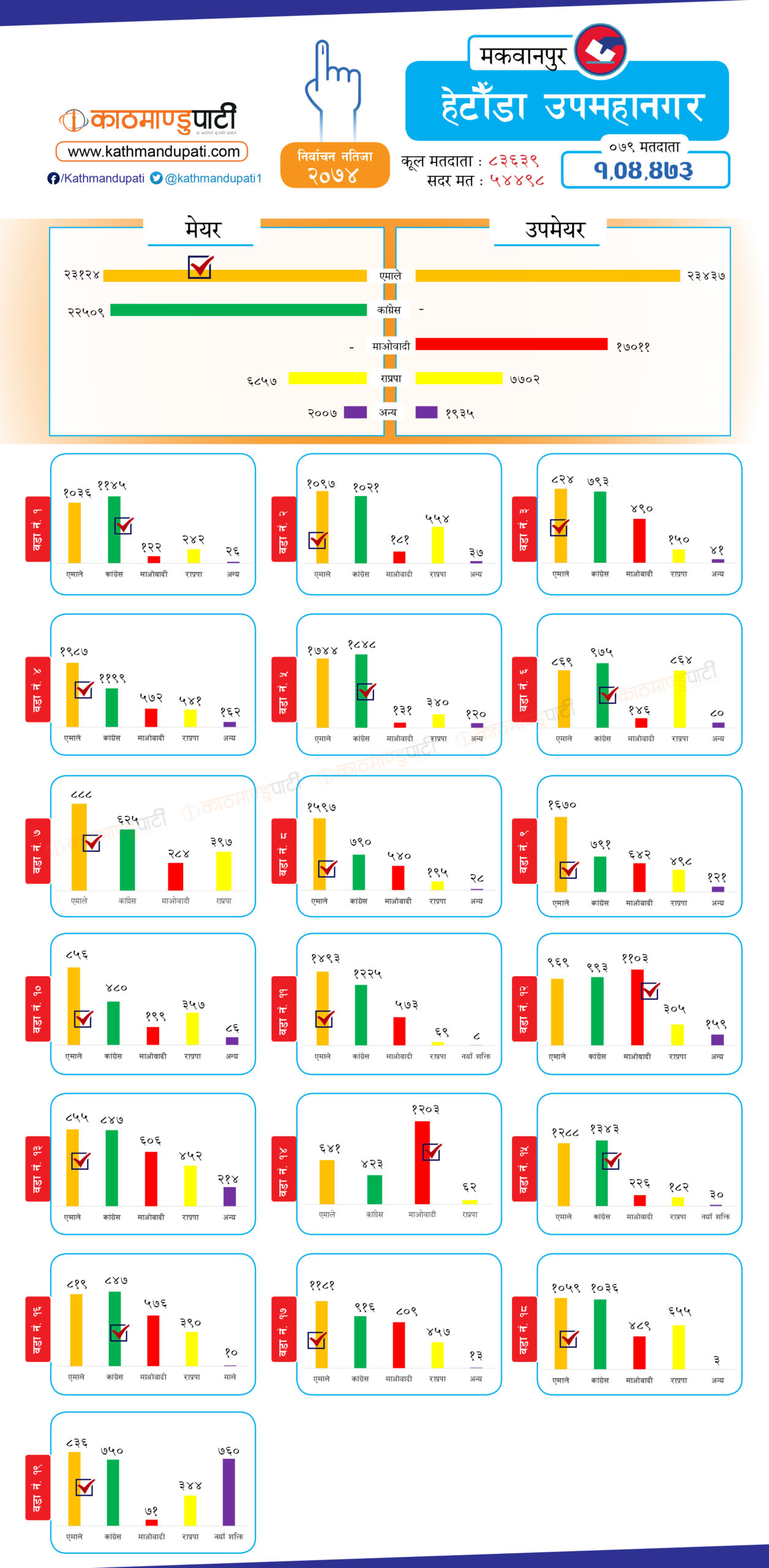 उपमेयरमा पनि एमालेकै मीनाकुमारी लामा २३ हजार चार सय ३७ मत ल्याएर विजयी भइन् । गठबन्धनबाट उम्मेदवार बनेका माओवादी केन्द्रका बलराम बलले १७ हजार ११ मत मात्रै पाए । राप्रपाकी इन्दिरा न्यौपानेले सात हजार सात सय दुई मत पाइन् । वडामा पनि एमालेले बहुमत हासिल ग¥यो । १९ वडा रहेको हेटौँडामा एमालेले १२ वडाध्यक्ष जित्यो । कांग्रेसले पाँच र माओवादीले दुई वडामा अध्यक्ष जिते ।