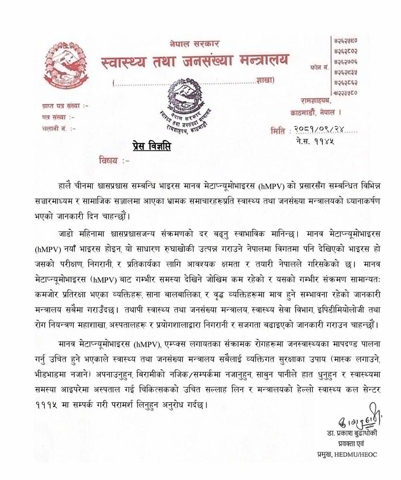 मन्त्रालयले यसबारे विभिन्न सञ्चारमाध्यम र सामाजिक सञ्जालमा गरिएका भ्रामक प्रचारप्रति ध्यानाकर्षण भएको जनाउँदै त्यस्ता हल्लाको पछि नलाग्न आग्रह गरेको छ । जाडो महिनामा श्वासप्रश्वासजन्य सङ्क्रमणको दर बढ्नु स्वाभाविक भएको र मानव मेटाप्न्यूमो भाइरस नयाँ भाइरस नभएको मन्त्रालयको भनाइ छ ।