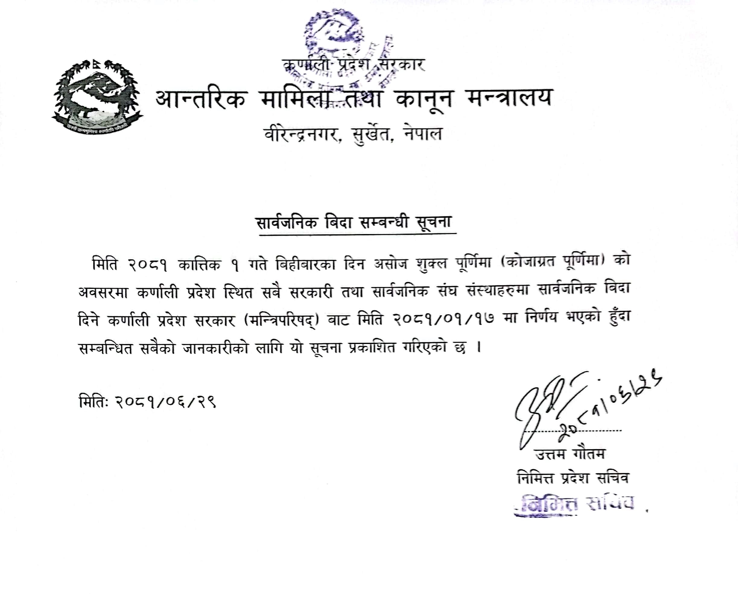 गत वैशाख १७ गते बसेको कर्णाली प्रदेश सरकार मन्त्रिपरिषद् बैठकको निर्णय अनुसार आज प्रदेश भर बिदा दिइएको सूचनामा उल्लेख छ । आज प्रदेश भरका सबै सरकारी तथा सार्वजनिक संघसंस्थाहरू बन्द रहने छन्