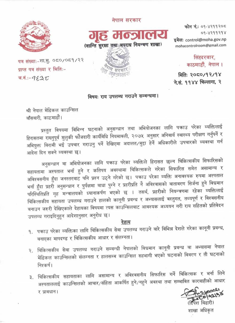 गृहले नेपाल मेडिकल काउन्सिललाई एक पत्र लेख्दै पक्राउ परेका व्यक्तिका लागि चिकित्सा सेवा उपलब्ध गराउने बारे विभिन्न देशले गरेका कानुनी प्रबन्ध, नेपालमा विद्यमान कानुनी प्रबन्ध र अभ्यास तथा चिकित्सीय सहायताका लागि असामान्य र अविश्वसनीय सिफारिस गर्ने चिकित्सक र भर्ना लिने अस्पताललाई काउन्सिलको आचार संहिता आकर्षित हुने नहुने बारे राय मागेको हाे ।
