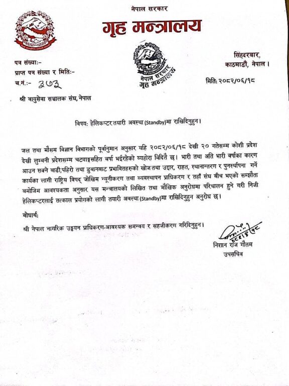 शनिबार संघलाई पत्राचार गर्दै मन्त्रालयले लिखित तथा मौखिक अनुरोधमा परिचालन हुने गरी निजी हेलिकोप्टरलाई तत्काल प्रयोगका लागि तयारी अवस्थामा राखिदिन पत्राचार गरेको छ ।