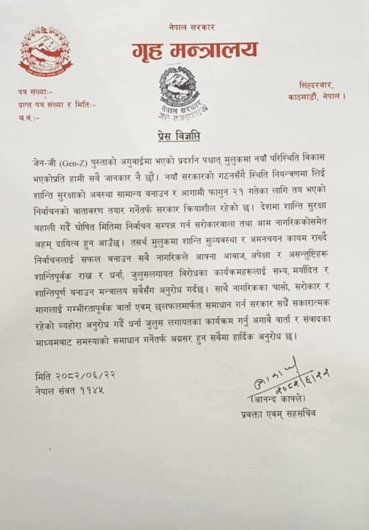 गृह मन्त्रालयका प्रवक्ता एवं सहसचिव आनन्द काफ्लेले बुधबार प्रेस विज्ञप्ति जारी गर्दै नयाँ सरकार गठनसँगै शान्ति सुरक्षा बहाली गर्न तथा आगामी फागुन २१ गतेका लागि तय भएको निर्वाचनको वातावरण बनाउन सरकार क्रियाशील रहेको जनाएका छन् ।