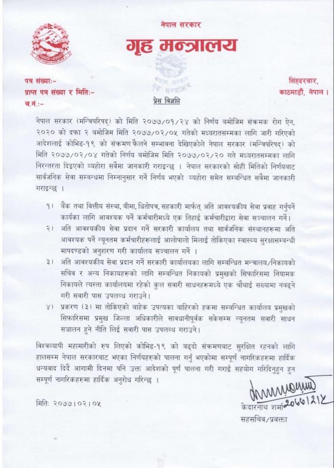 त्यस्तै गृहले ति आवश्यकीय सेवा प्रदान गर्न सरकारी कार्यालय तथा सार्वजनिक संस्थानहरुमा अति आवश्यकपर्ने न्यूनतम कर्मचारीलाई आलोपालो गरी कार्यालय सञ्चालन गर्नेुपर्ने बताएको छ ।