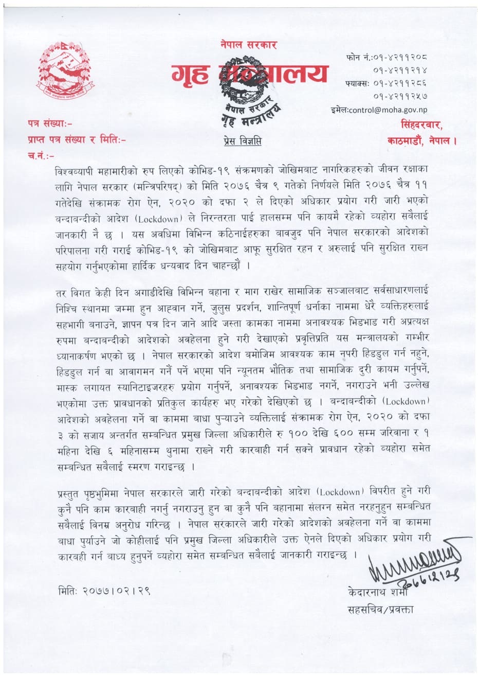 बिहीबार गृहले एक विज्ञप्ति जारी गर्दै लकडाउनको समयमा आन्दोलनमा हिँड्नेलाई संक्रामक रोग ऐन २०२० को दफा ३ अनुसार कारबाही गर्ने चेतावनी दिएको छ ।