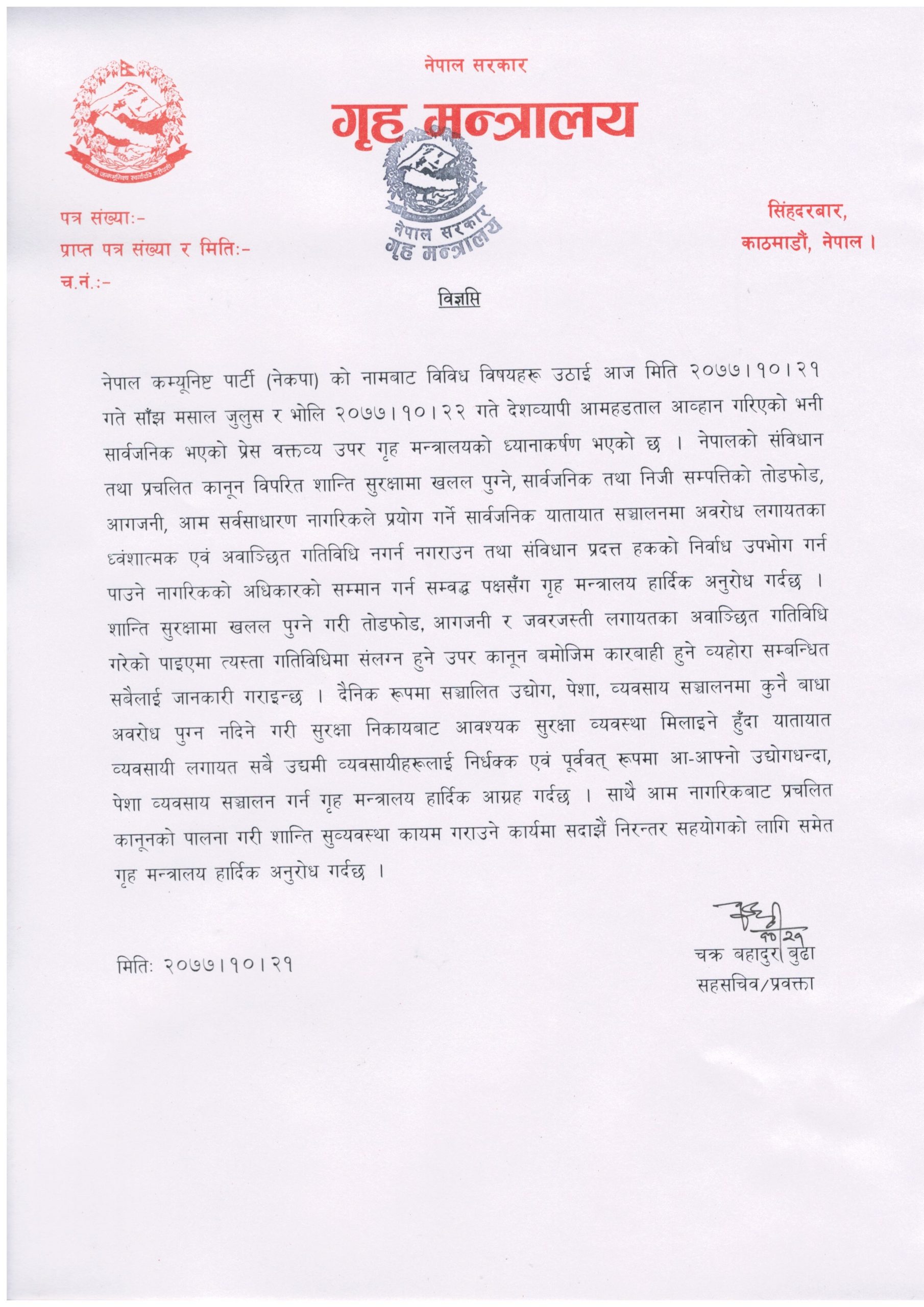 बुधबार गृहमन्त्रालयका प्रवक्ता चक्र बहादुर बुढाले एक विज्ञप्ति जारी गर्दै यातायात, व्यवसाय, उद्योगमा अवरोध गरे कानून बमोजिम कारबाही गर्ने चेतावनी दिएका छन् ।