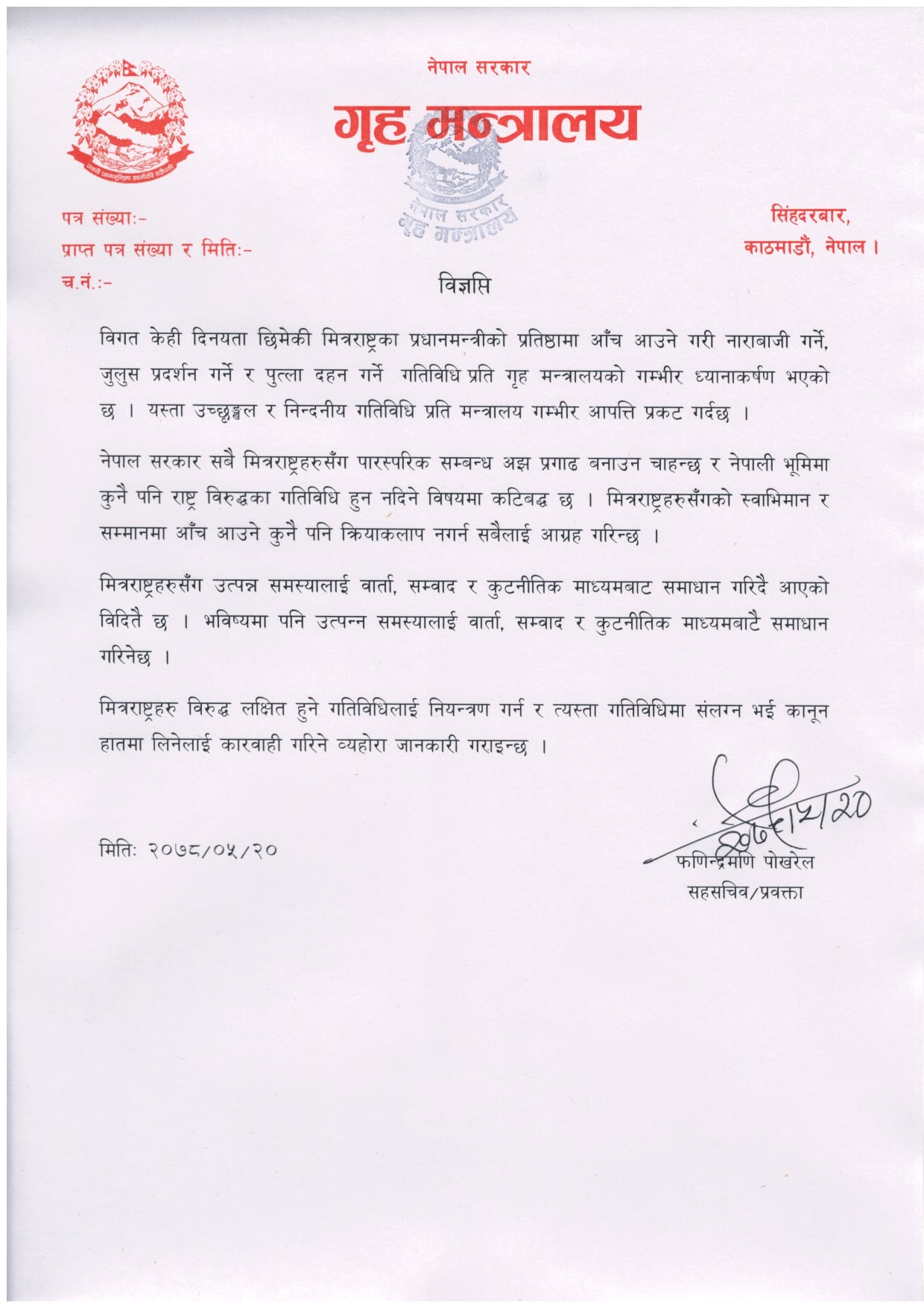 मन्त्रालयका प्रवक्ता फणिन्द्रमणि पोखरेलले एक विज्ञप्ति जारी गर्दै छिमेकी मित्र राष्ट्रका प्रधानमन्त्रीको प्रतिष्ठामा आँच आउने गरी नाराबाजी गर्ने, जुलुस निकाल्ने र पुत्ला जलाउनेमाथि कारबाही गर्ने चेतावनी दिएका हुन् ।