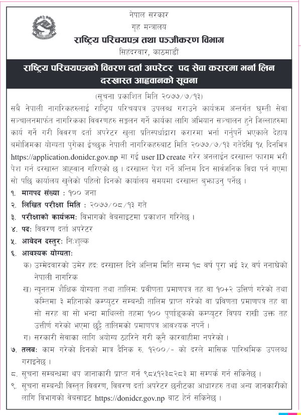 इच्छुकले आजदेखि १५ दिनभित्रमा दरखास्त फारम भर्न सक्नेछन्। लिखित परीक्षा भने मंसिर १३ गते हुनेछ। १८ वर्ष पूरा भई ३५ वर्ष ननाघेको नेपाली नागरिकले दरखास्त दिन सक्ने विभागले निकालेको सूचनामा उल्लेख छ।  दरखास्त दिनेको योग्यता प्लस टु पास गरेको हुनुपर्नेछ। काम गरेको दिनको एक हजार दुई सयका दरले पारिश्रमिक उपलब्ध गराइने विभागको भनाइ छ।